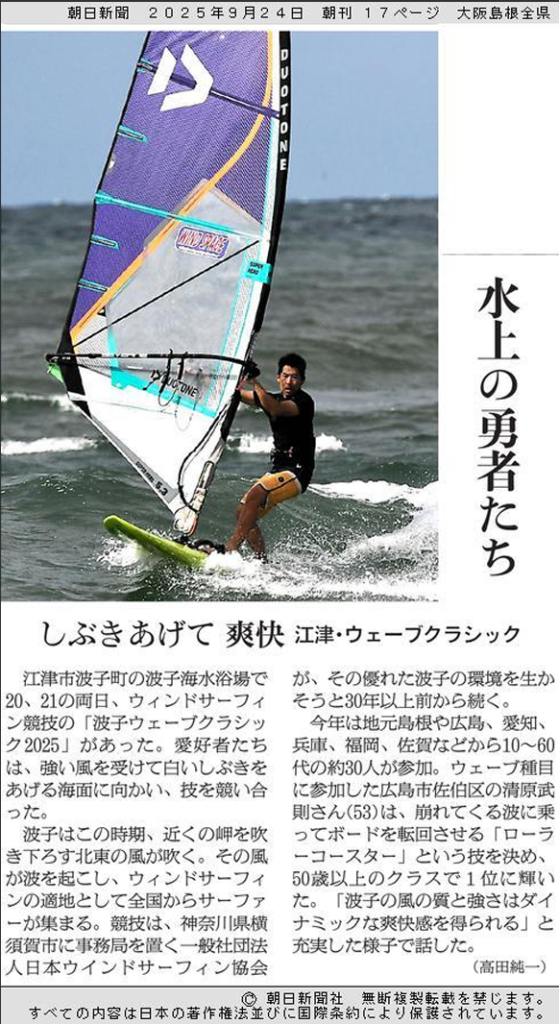 9月20日から開催された『JWA WAVE CHALLENGE AMATEUR RANKING第2戦 HASHI WAVE CLASSIC2025』で、朝日新聞から取材を受け、紙面に掲載していただきました。